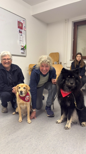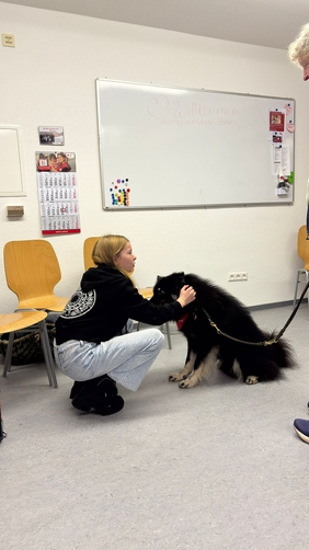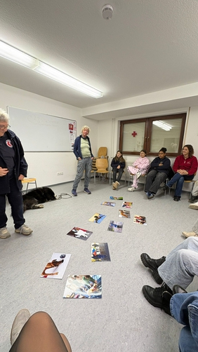 Claudia stellte ihren elfjährigen Chicco vor, der ein Mischling ist und schon seit vielen Jahren DRK-Therapiehund ist. Beate zeigte auf das Halsband ihres fünfjährigen Catos, eines Eurasier, der aktuell in der Ausbildung zum Therapiehund ist. Die zehn JRKler waren von Anfang an begeistert.