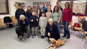 Die Sechs- bis 14-Jährigen hörten gespannt zu. Einige haben daheim auch einen Hund oder mögen Hunde sehr, wie Even. Er freute sich ganz arg, dass die Hunde im Eutinger DRK-Heim waren und fragte nach: "Darf auch ein Rottweiler Therapiehund werden?" Claudia Schmitt-Neumann erklärte, dass nicht jeder Hund ein Therapiehund sein kann. Er braucht ein gutes Wesen und muss die Gehorsamprüfung absolvieren sowie weitere Ausbildungs-Elemente.